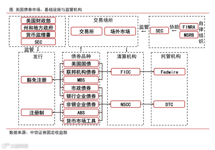 不同品种的债券同样托管在不同的机构。美国债券市场的托管机构包括美联储开发的Fedwire系统和DTC。美国国债、联邦机构债和机构MBS将托管在Fedwire的簿记系统之中,投资者可以直接持有这些债券,也可以通过中介机构间接持有债券。企业债券、市政债券等券种则托管在DTC的簿记系统之中,投资者同样可以通过DTC的DRS系统直接持有债券,或是通过其他中介机构间接持有。