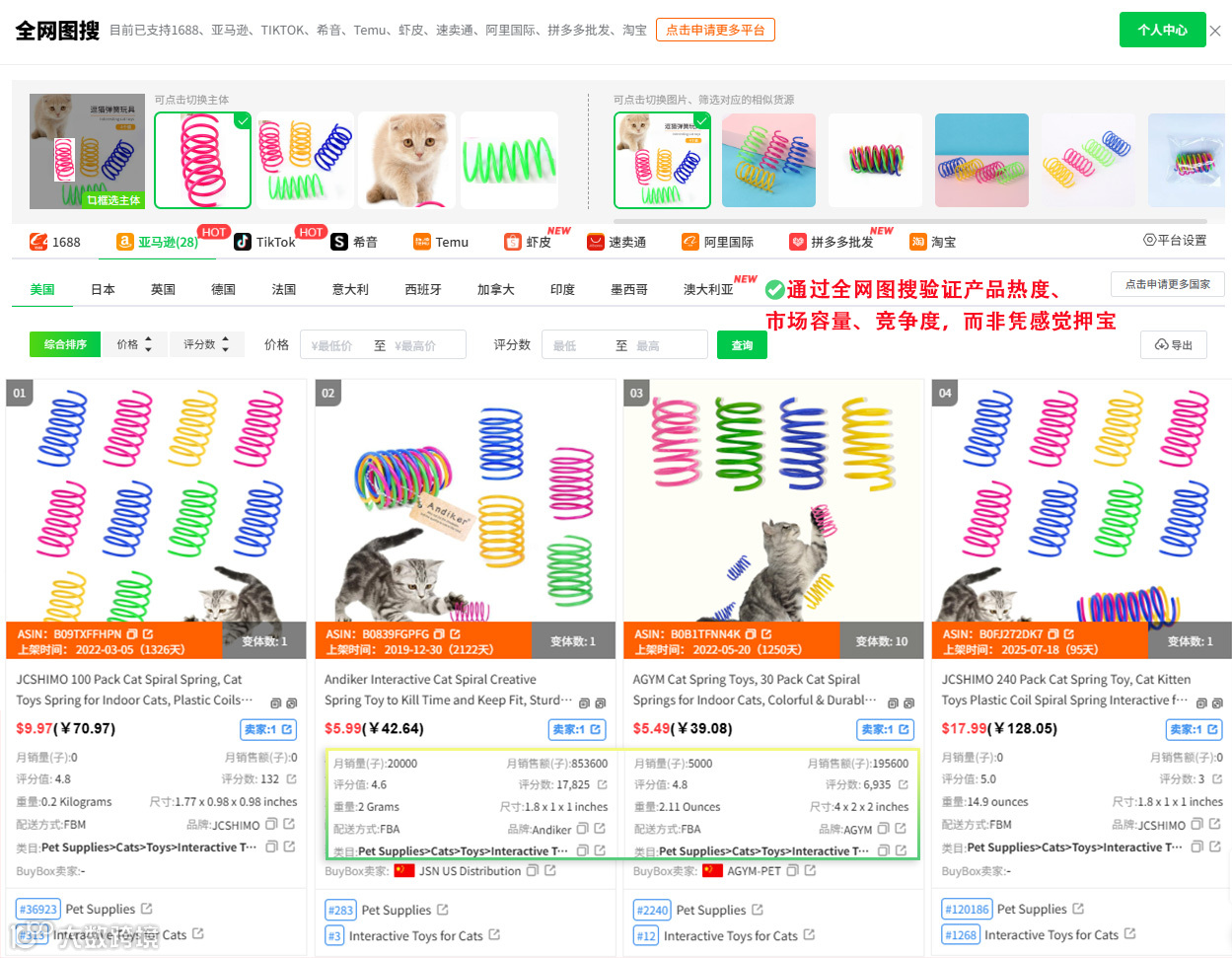 2、利用工具分析市场:通过店雷达跨境选品工具,例如在国家热门货盘中,我们就可以通过不同国家用户在1688上的商品销售趋势,找到符合目标用户的需求产品,再从全网图搜中查看亚马逊、tk、temu等不同平台上的商品热度、市场容量、竞争度,用数据驱动决策,提高选品的成功率。