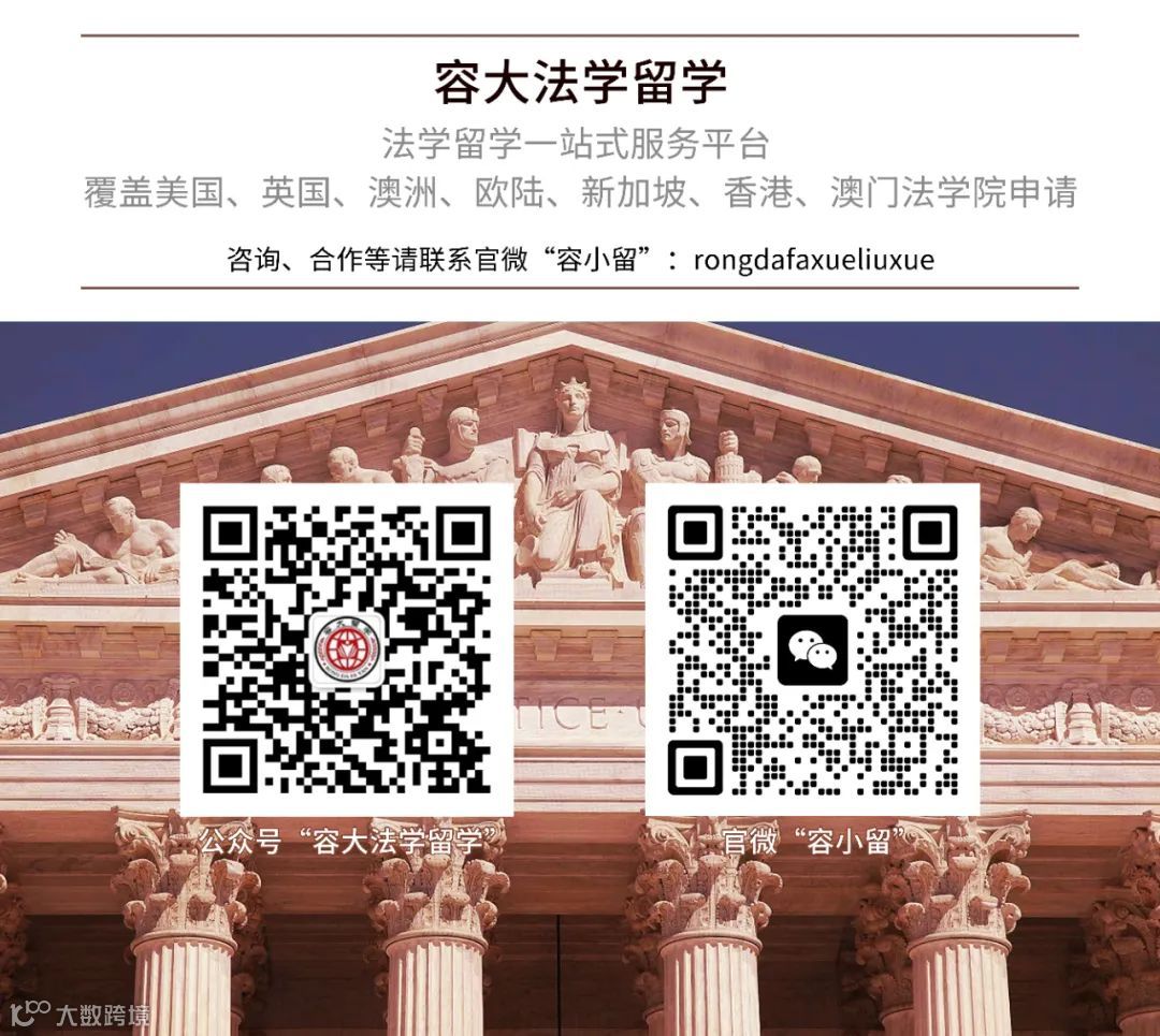如果在法学留学方面有任何疑问或需求,欢迎扫描文末右侧二维码添加官微“容小留”(微信号:rongdafaxueliuxue),资深留学顾问老师将为你答疑解惑。