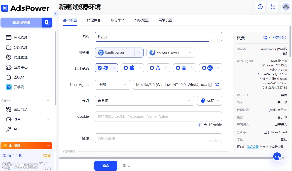 注册下载 AdsPower,免费领取2个浏览器环境,开始搭建你的Fiverr账号吧!