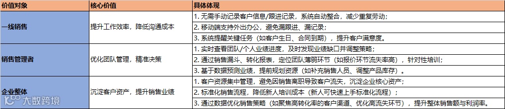 无论是中小型企业还是大型企业,CRM销售管理模块都能带来显著价值,具体可分为“对销售”“对管理者”“对企业”三个层面: