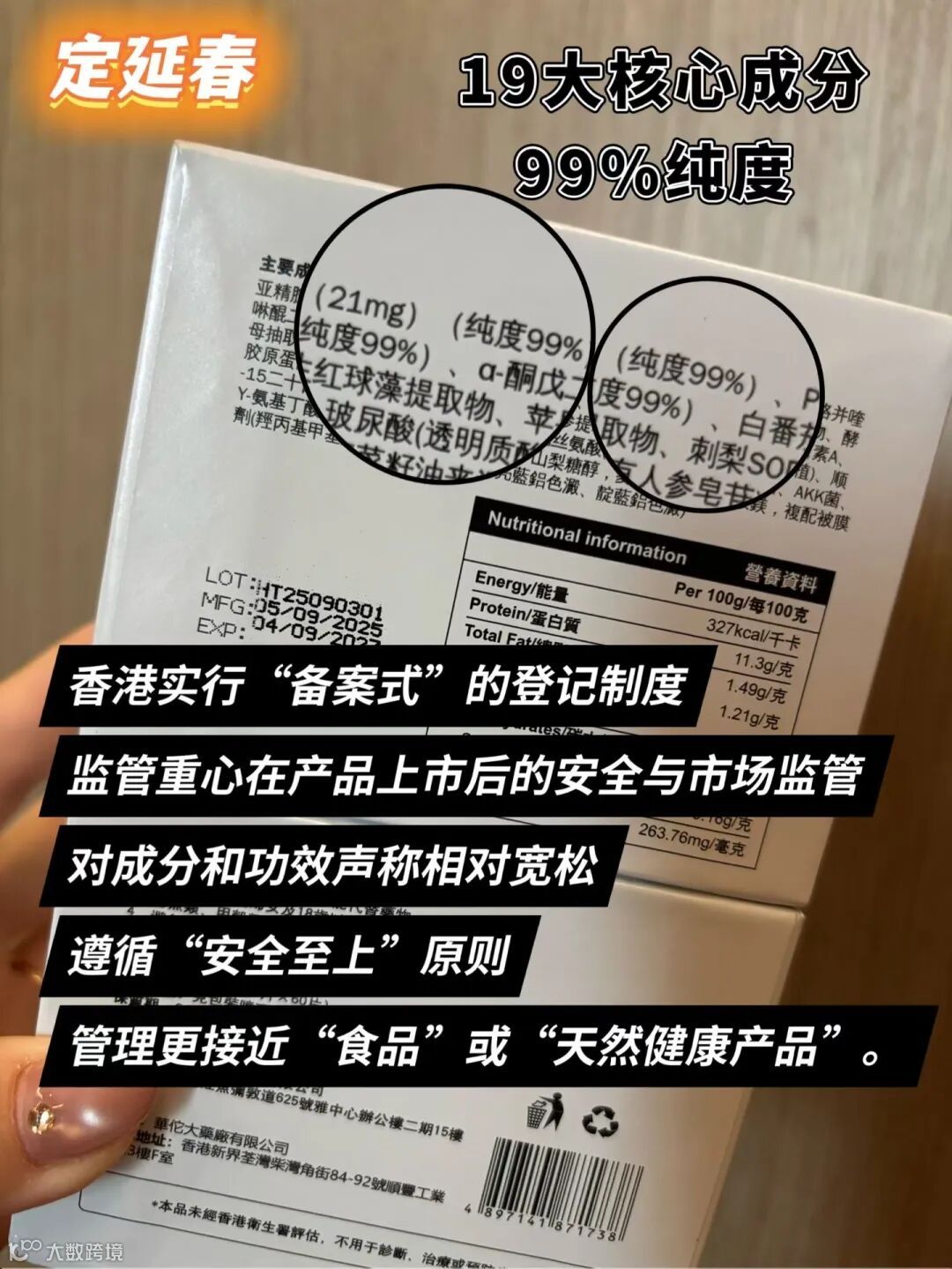 面对行业内常见的“跨境购规避监管”问题,定延春直接拿下FDA GRAS、GMP、USP、EFSA等全球全线认证,同时符合RCEP和欧盟Cosmos标准,从原料采购到生产流通,每个环节都踩实合规红线,无需靠“擦边球”宣传博取信任。