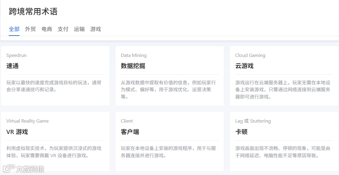 大数跨境常用术语工具专为跨境电商从业者设计,深度整合跨境收款、物流、税务、平台规则等核心领域的专业术语库。