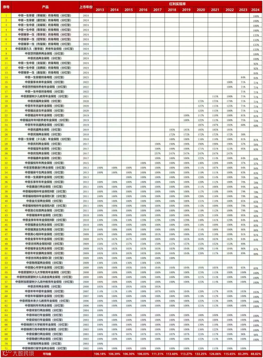 中意人寿有20多年的分红险历史,截至2024年末,累计经营分红险产品90余款。而且连续12年公布了分红实现率,是目前少数长期公布分红实现率的保司,非常透明。