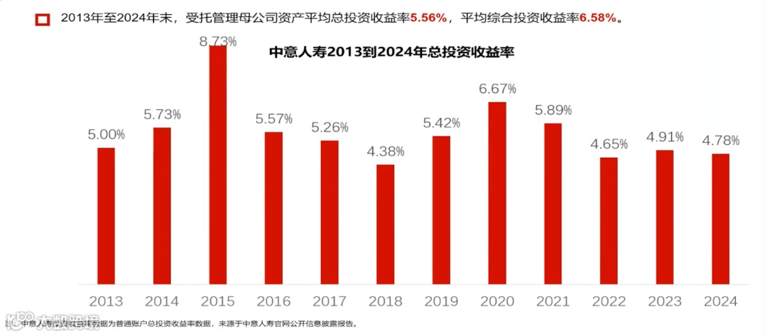 截至2024年末,中意资产累计管理资产超过3789.4亿元,其中中意资产母公司业务占比39.2%,第三方业务规模占比达60.8%。2013年末至2024年末,受托管理母公司资产平均总投资收益率5.56%,平均综合投资收益率6.58%。