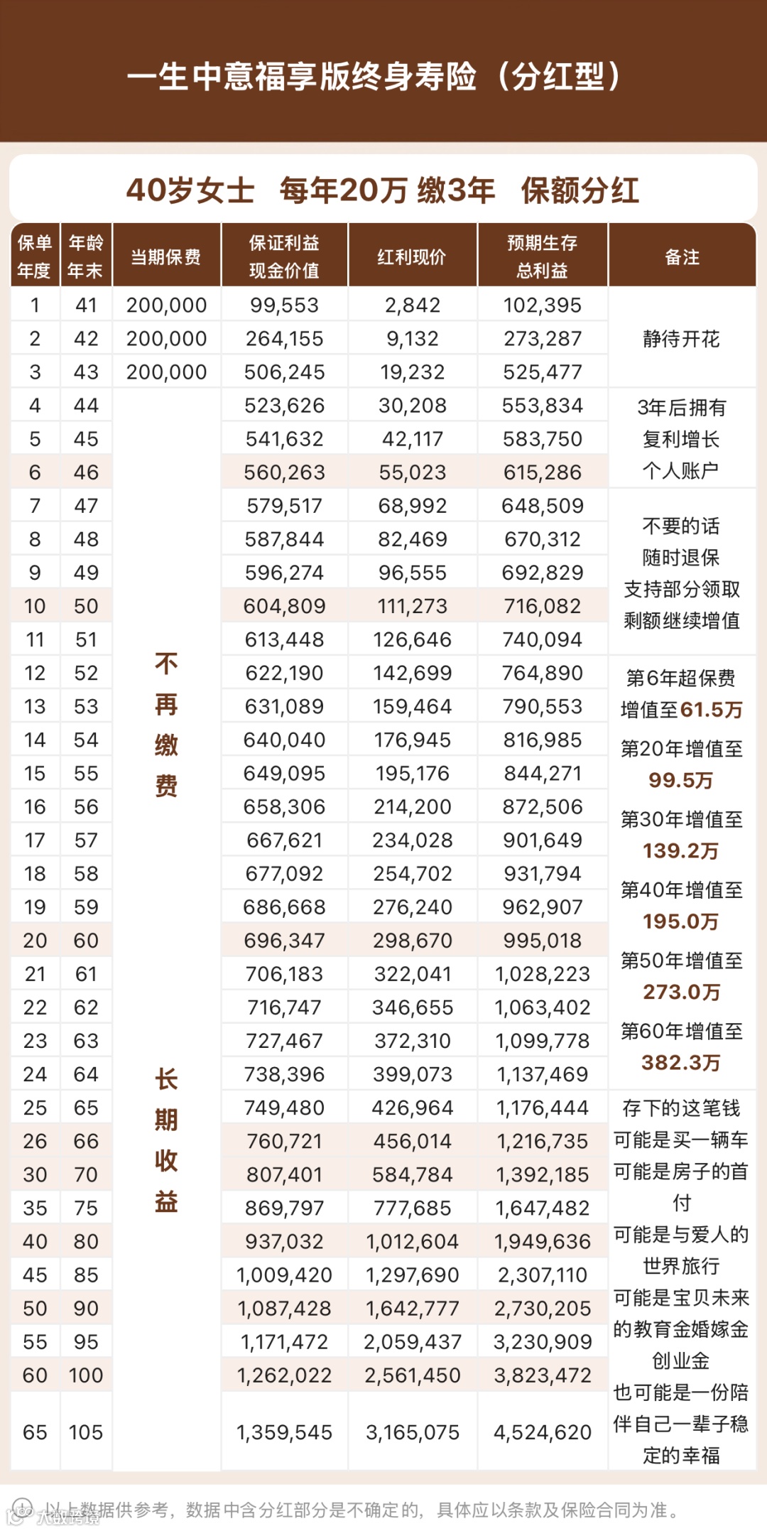 以下为利益演示案例:40岁女性,20万3年交,按照100%分红演示,预期生存总利益第6年61.5万(超过已交保费),第30年增值至139.2万(两倍多),第40年195万(3倍多)......