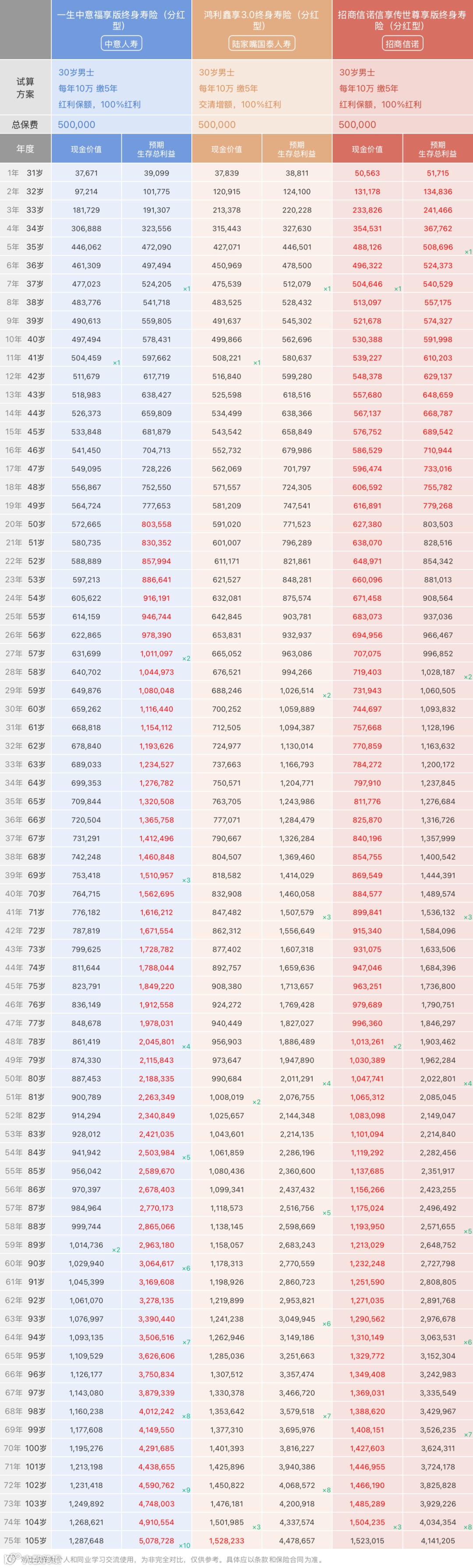 由上面利益演示对比可以看出,招商信诺信享传世尊享版的保证利益最高,因为保底利率更高,预期生存总利益在前19年稍占优势,但是中意一生中意(福享版)长期来看完全碾压另两款,陆家嘴国泰鸿利鑫享3.0 则中规中矩。