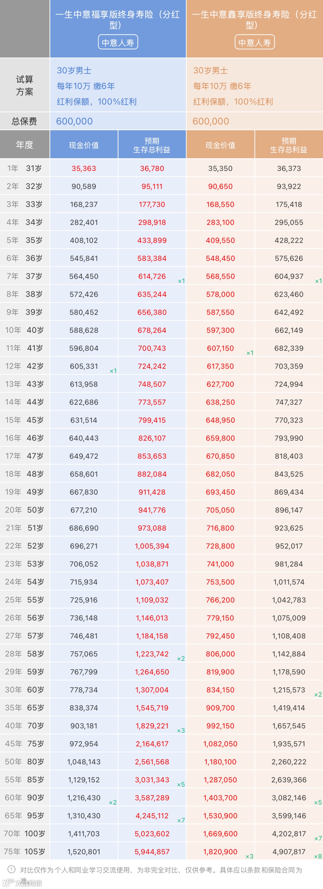 虽同为中意人寿旗下产品,但(鑫享版)是预定利率下调后的新产品,【保证利率1.75% + 演示利率3.75%】。从下面对比表我们看到,加上分红后的预期生存总利益,(福享版)从一开始就超出(鑫享版),而且时间越长差距越大。