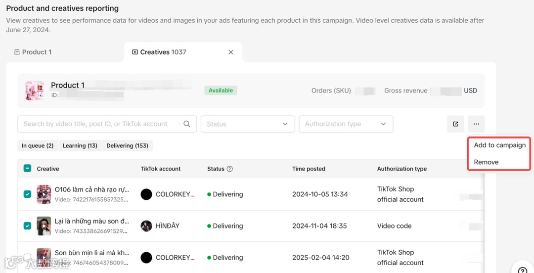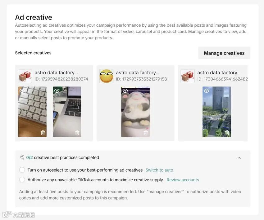 若视频在创作者分析中可见,但广告创建时不可用 → 创作者未开启批量授权,需要联系达人开启批量授权,或索取视频代码单独授权 -