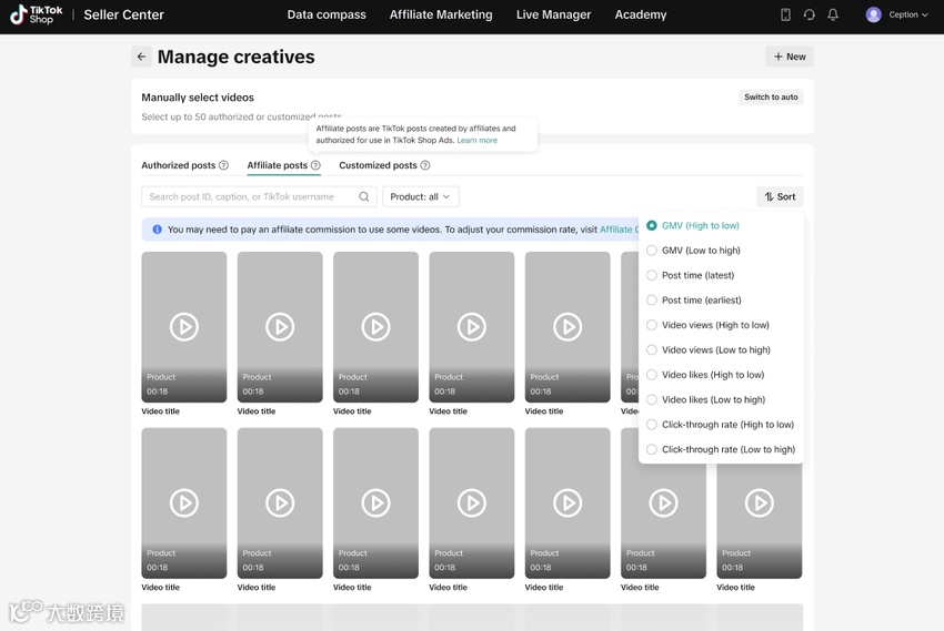 后续升级:只需一次性授权,达人就可以授权商家使用他们任意的联盟帖子来投放广告。所有商家都可以在TTAM中自动找到所有已被授权的联盟帖子,且无需单独索取视频代码(Video code)。这些授权的联盟帖子也将自动应用于GMV Max。
