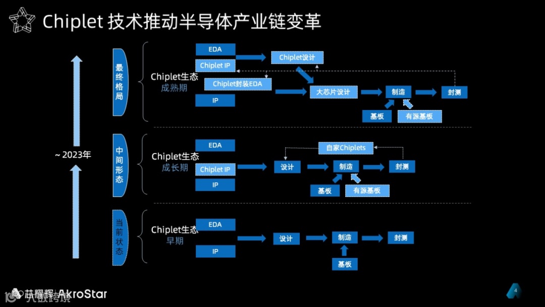 早期阶段即芯片分拆和与之对应的先进封装定义协议的“散装化”阶段,统一的标准亟待理清和确定;成长期则是Chiplet芯片部分单元在工艺上进行迭代并寻找最优解的阶段,这时,工艺和互联标准也在快速逐步成型和统一;曾克强预计,到2027年左右Chiplet生态才会真正进入“IP硬化时代”,彼时会诞生一批针对Chiplet技术应运而生的Fabless公司,有源基板供应商、支持集成Chiplet的EDA公司等等,围绕Chiplet产业的IP生态圈将会更加立体和丰满,相关上下游供应商的协同性也会更加系统化。