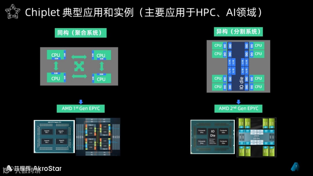 “同构”通过高速接口IP的实现和先进封装,以相同的Die设计实现计算能力的扩展,适用于CPU、TPU、AI SoC等低延迟和低误码率的应用场景;而“异构”则是将芯片的功能做差异化的拆分,做到“异”和“构”的有机结合——负责高算力和性能的先进工艺的Die和负责特色功能的成熟制程的Die被封装在一起。这两种最典型的实用案例可以通过AMD服务器CPU Epyc系列具体而微地得到展现。