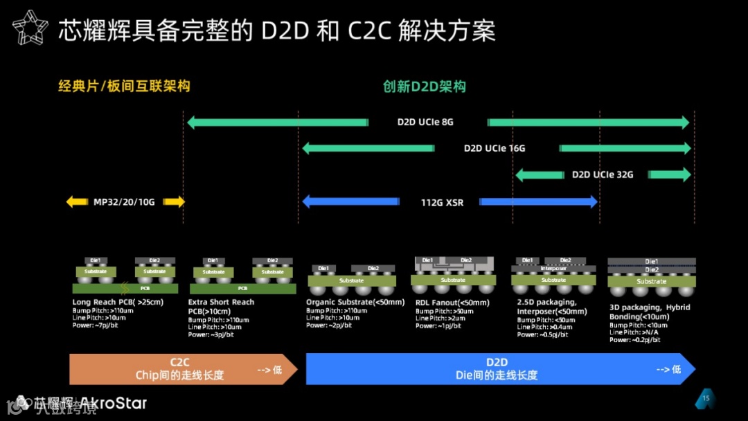 芯耀辉作为国内领先的先进接口IP供应商,具备完整的D2D(Die to Die)和C2C(Chip to Chip)解决方案。在Chiplet技术框架下,芯耀辉提供了能够满足不同封装、互连和应用需求的多维度,全方位的解决方案,不断满足客户对最佳性能和灵活性的需求,具体到Chiplet D2D解决方案,无论是长距离的互连、超短距离的高速通信,还是不同封装层次的需求,芯耀辉均可精准匹配用户应用场景。