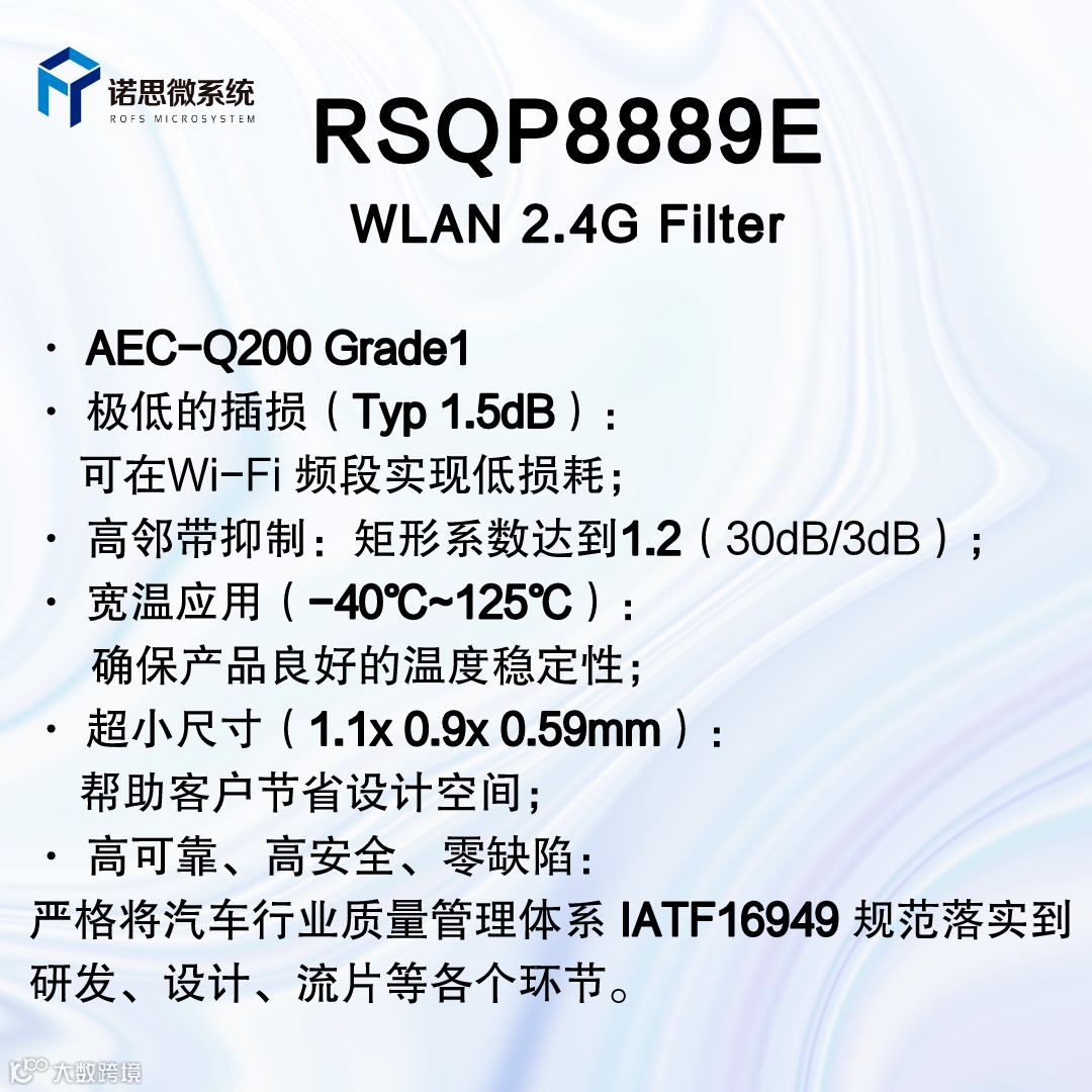 于今年9月成功制备出高性能、高Q值、宽温应用(-40℃~125℃)、高可靠性的车规等级高性能2.4G WiFi滤波芯片RSQP8889E!