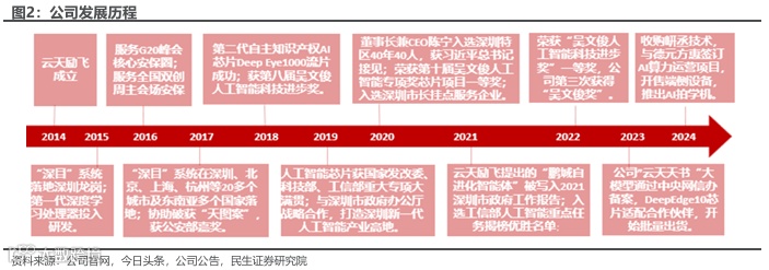 2014年成立,AI技术多领域取得成绩。公司于2014年成立,2015年第一代深度学习处理器投入研发入选国务院侨办“重点华侨华人创业团队”,2016年服务G20峰会核心安保圈,2017年“深目”系统在深圳、北京、上海、杭州等20多个城市及东南亚多个国家落地协助破获“天图案”, 2019年人工智能芯片获国家发改委、科技部、工信部重大专项大满贯与深圳市政府办公厅战略合作。2020年,创始人陈宁入选深圳特区40年40人,获习近平总书记接见,荣获第十届吴文俊人工智能专项奖芯片项目一等奖。2021年,入选工信部人工智能重点任务揭榜优胜名单。
