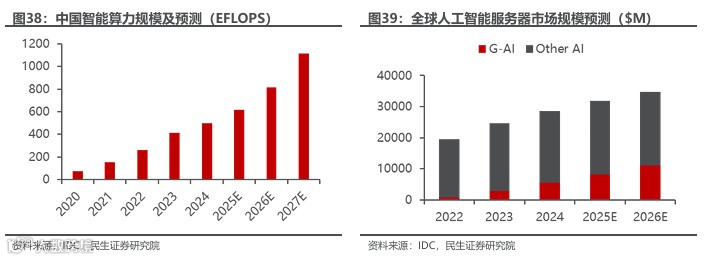 计算所需的服务器设施市场规模持续提升。IDC预计,全球人工智能硬件市场(服务器),将从2022年的195亿美元增长到2026年的347亿美元,CAGR达15.46%;其中,运行生成式人工智能的服务器市场规模在整体人工智能服务器市场的占比将从2023年的11.9%增长至2026年的31.7%。随着生成式人工智能的发展,市场对于高性能的人工智能服务器需求或将持续增长。