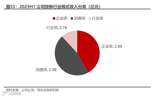 进入2024年以来,公司积极拓展企业级与消费级AI项目与产品,叠加并表岍丞技术,公司将营业收入重新进行分类,并分类为企业级、消费级、行业级三类业务进行披露。三项业务2025年上半年营业收入分别为2.69/2.98/0.76亿元,占比分别为41.84%/46.35%/11.82%。