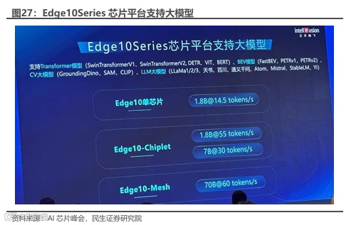 Edge10Series芯片平台支持大模型。据云天励飞2024年11月AI芯片峰会的宣传,公司芯片平台支持Transformer模型(SwinTransformerV1、SwinTransformerV2,DETR、VIT、BERT)、BEV模型(FastBEV,PETRv1,PETRv2)CV大模型(GroundingDino,SAM,CLIP)、LLM大模型(LLaMa1/2/3、天书、百川、通义千问、Atom、Mistral、StableLM、Yi)。生成速率上,Edge10单芯片为1.8B@14.5 tokens/s;Edge10-Chiplet为1.8B@55tokens/s或7B@30tokens/s;Edge10-Mesh为70B@60tokens/s。
