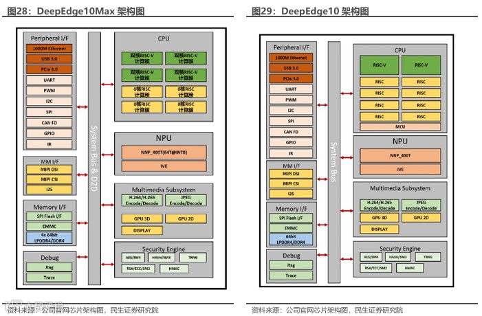 公司自研芯片结构助力多场景应用落地。DeepEdge10Max搭载了4个八核64位RISC通用处理器计算簇,4个双核64位RISC-V处理器计算簇,支持RV64GCV指令集,支持256-bit数据位宽。DeepEdge10搭载了八核64位RISC通用处理器,双核64位RISC-V 处理器,支持RV64GCV 指令集,支持64-bit 数据位宽。
