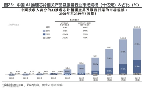 推理芯片市场规模未来高速增长,NPU在细分品类中增速最高。根据公司招股说明书,中国AI推理芯片相关产品及服务行业快速增长,市场规模预计从2020年的113亿元增长到2024年的1626亿元,CAGR达94.9%;预计从2024年至2029年CAGR达53.4%,2029年市场规模或达13830亿元。从细分品类增速上看,2024-2029年GPU、NPU、其他品类CAGR分别为47.7%、72.3%、70.5%,NPU在AI推理芯片中增速最高。