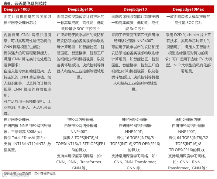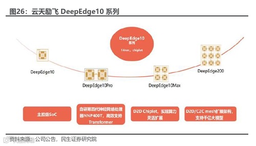 场景算法芯片化拓展推理AI市场。公司搭建了算法分析-指令集定义-芯片架构设计-工具链设计的AI芯片研发设计流程,通过自定义指令集、处理器架构及工具链的协同设计,实现算法技术芯片化。公司AI芯片主要面向嵌入式前端和边缘计算应用,具备高性能、低功耗、低成本的优点。在2022年流片的Edge10针对Transformer的计算需求进行了优化,凭借自研芯片DeepEdge10创新的D2Dchiplet架构打造的X2000、X6000系列推理卡,可应用于语言、视觉、多模态等各类大模型的推理加速,目前已适配云天天书、通义千问、百川智能、Llama2/3等近 10个主流大模型。