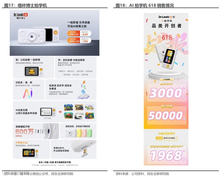 公司凭借模型与芯片优势开拓端侧设备市场。公司的核心优势为芯片+模型算法的技术优势,公司凭借此技术优势,积极拓展AI上下游产业链,公司首先凭借模型优势开拓端侧设别市场。公司推出第一款自主研发品牌“噜咔博士”拍学机,设备内置公司自研大模型,基于百万级万物标签体系与百亿级跨模态语料库,秒级精准识别超4800个门类、230万种物品。AI拍学机在天猫、京东、抖音等渠道开启销售,产品按照内存区分分为两款,分别为32G和128G,价格分别为649元和799元,配色分别为荔枝白、石榴粉、柠檬黄、橄榄绿四种。AI拍学机在2025年“618”销售活动中,累计GMV3000万元,累计销量50000台。