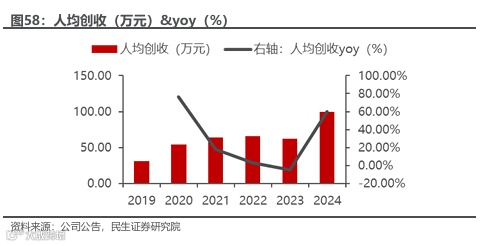 公司人均创收重新恢复增长趋势。我们将公司营收与公司总人数进行对比,可以发现公司人均创收在2023年出现小幅下降,2024年,人均创收重新恢复增长趋势,同比增长达59.93%,公司人效进一步提升。