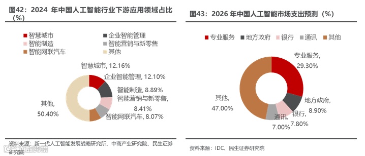 AI应用领域智慧城市与企业管理需求占比高,专业服务与地方政府占据需求主导。未来随着AI大模型技术的进步,AI对各行各业的影响逐步扩大,对应的AI应用市场有望迎来快速扩容期,细分市场所对应的行业及客户或成为AI应用企业重点布局领域。据新一代人工智能发展战略研究所数据,2024年中国人工智能行业下游中智慧城市、企业智能管理、智能制造为占比前三细分行业,分别为12.16%、12.10%、8.89%。据IDC预测,2026年中国人工智能市场支出预测(行业)前三分别为专业服务、地方政府、银行,占比分别为29.3%、8.9%、7.8%。AI行业应用逐步落地过程中,精准定位细分市场与客户的企业有望因此受益。