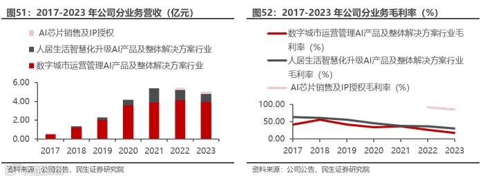 公司从上市初的行业解决方案为主转换为智能硬件、智算运营、智能应用三方向发展为主。 公司上市初,主要业务以AI应用服务为主,公司主要披露的营业收入主要以人居生活智慧化升级AI产品及整体解决方案行业和数字城市运营管理AI产品及整体解决方案行业为主,2018年-2023年,两项业务分别从1.22、0.12亿元增长至3.92、0.85亿元,CAGR分别为126.29%、147.93%,行业呈现高增速。数字城市业务在2023年受经济环境影响下滑,人居生活自2022年受公共卫生事件影响出现下滑。