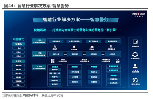 智慧公安,从被动警务到预防警务。公司利用AI技术结合视频巡逻,打造面向全场景主动警务和预防警务的“新引擎”,包含“一平台、一机制、N场景”。一平台实现导防导稳导侦,包含数据驾驶舱、大模型分析报告、算力部署建议、勤务考核管理。一机制实现事件快速处理,主城区1分钟快速反应、重点区域3分钟现场处置、人群密集场所5分钟现场处置,事后进行人工复审。N场景实时感知异常事件,在治安置点、涉政涉恐、专项勤务、警情高发区域、灾害易发区域、涉警预警场景进行部署,实现从被动警务到预防警务。