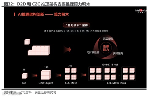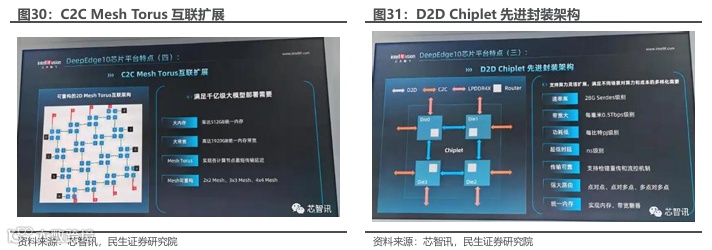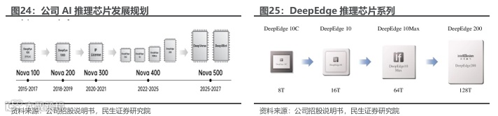 多代AI推理芯片持续发展,算力水平持续提升。公司推理芯片目前已更新至第四代,DeepEdge系列对应Nova 400,采用算力积木设计,融合D2D chiplet和C2C mesh tour互连技术。DeepEdge10系列可支持单个芯片8T至128T的算力需求。