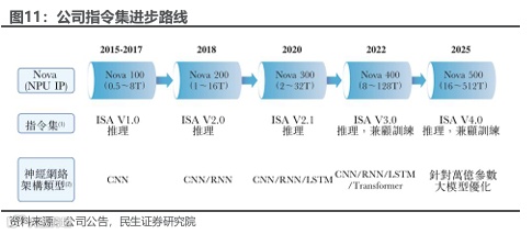 公司持续加强神经网络处理器技术研发,持续迭代逐步实现自主可控。公司定义了针对深度学习神经网络算法优化的ISA。公司NPU产品Nova,通过差异化设计战略,可同时应对终端、边端与云端推理场景。公司NPU指令集由ISA V1.0升级到ISA V4.0,架构大幅演进,增强了对更广泛模型和运算能力的支援。同时通过高并发流水线并行,该架构能够对复杂 AI 工作负荷进行高效处理,大幅提升了计算吞吐量和跨应用场景部署效率。