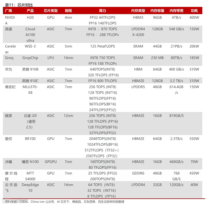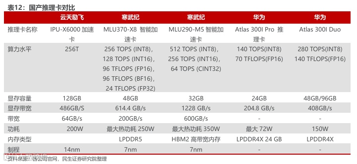 国产AI芯片与海外芯片相比仍有差距,部分场景逐步实现国产替代。将国产AI芯片与海外芯片做对比,海外芯片在用于训练的浮点运算以及用于推理的整数运算上,算力水平均高于国产芯片,部分国产芯片存在相对功耗比优势。由于推理场景的算力需求相对有限,部分场景可逐步实现国产替代。