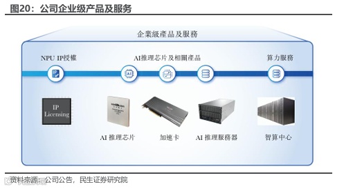 企业级业务方面,以推理芯片为核心,拓展系列产品;凭借算力储备提供算力支持与运维服务。公司自研AI芯片,打造了覆盖NPUIP、SOC芯片、SOC模组、边缘计算盒子、AI推理服务器及智算集群的系列产品,广泛应用在摄像头终端、车路云、机器人、智算中心等场景。该项业务包括IP授权、芯片、服务器整机和智算中心等,未来计划在云边端推理加速计算等场景提供高能效、低功率和高实时性要求的算力,并寻求在使用量级上持续突破,以AI推理加速卡、服务器整机、智算集群提供服务等形式,基于原有生态上持续扩大在 AI 公司、互联网厂商等的国产化AI算力机会。