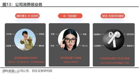 消费级应用场景主要为多种AI端侧设备。在消费级业务上,公司销售产品为推理AI场景的各类硬件设备,包括可穿戴设备类产品、AI交互类产品等。2024年,公司成立子品牌“噜咔博士”,推出大模型原生教育硬件产品,和合作伙伴闪极科技推出联名智能眼镜产品,以及子公司岍丞技术为多个知名品牌提供智能耳机和智能手表的芯片模组、操作系统及产品设计服务。依托公司自研的大模型或系统、软件应用等为消费级产品提供技术基础,以硬件形式进行交付。