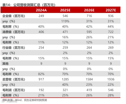 企业级:1)收入:公司企业级产品以推理芯片为核心,拓展系列产品,同时凭借算力储备提供算力支持与运维服务。公司该项业务营收为算力服务业务营收叠加以芯片为核心的相关的推理卡、边缘计算盒子、一体机等产品。公司算力服务业务营收规模较大,并于2024年下半年计入收入,2025年全年计入收入,因此预计2025年企业级业务增速提升较快,后续增速放缓。我们预计公司企业级营业收入2025-2027年增速分别为120%、31%、31%。2)毛利率:考虑到公司核心芯片产品加速卡推出,加速卡为高毛利率产品,相关产品起量有望带动毛利率提升,预计2025-2027年毛利率分别为40%、42%、44%。