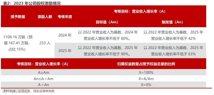 公司推行股权激励,充分调动人才积极性与凝聚力。公司推出限制性股票激励计划,计划向董事、高级管理人员、核心技术人员、核心骨干等共计233人授予1106.16万股限制性股票。首次授予部分考核目标为以2022年为基数的营收增长率,考核年度为2024-2025两个会计年度。公司通过股权激励进一步提升员工积极性。