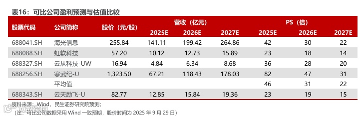 公司作为人工智能推理侧的领先企业,凭借自身软件算法与硬件设计等优势,从企业级、消费级、行业级三方渠道拓展公司产品销售。公司核心主业为推理芯片设计、并以推理芯片为核心生产销售推理卡、一体机、端侧设备等,在销售硬件设备的同时,也凭借算法优势销售软硬一体的行业解决方案。我们选取与公司同样销售AI芯片的芯片设计公司寒武纪、海光信息以及主业为AI行业解决方案的公司虹软科技、云从科技-UW作为可比公司。可比公司2025-2027年平均PS分别为46X、31X、22X,公司对应的PS分别为24X、20X、16X,公司2025-2027年PS均低于可比公司均值水平。