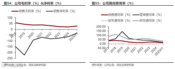 公司利润端承压,三费+研发费用率占比出现下降。公司毛利率在2018年达到高点,为56.34%,后续呈现下降趋势。2025H1,毛利率为28.50%,毛利率下降系公司新增业务中硬件比例提高,硬件产品相较软件产品毛利率偏低。利润端由于公司仍处于高研发投入阶段,公司尚未盈利,2025H1,公司净利率为-31.51%,净利端亏损幅度大幅减少。公司费用率近年来维持相对稳定,2025H1,公司销售费用率、管理费用率、财务费用率、研发费用率分别为13.41%/19.79%/1.99%/31.36%,较2024H1,费用率分别同比变动-15.23pct/-15.74pct/+3.74pct/-31.18pct,整体费用率出现下降,公司因营收规模扩大带来规模效应,费用率呈现下降趋势。