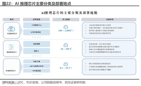 AI推理芯片可分为云、边、端三种类型,不同算力范围支持不同功能特征。AI推理芯片从类别上可分为云端、边缘端、终端。云端推理芯片主要部署在大型数据中心、公众云服务器,算力范围通常在100~1000T,支持高并发推理任务及大模型。边缘推理芯片主要部署在边缘网关、机器人,算力范围10~300T,适合需要快速响应及稳定运作的本地应用。终端推理芯片通常部署在智能手机、AR/VR头戴式装置、可穿戴设备,算力范围0.1~50T,在移动及电池驱动设备上实现毫秒级本地推理。