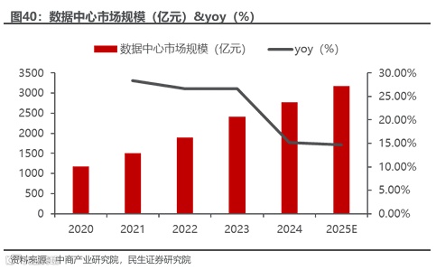 数据中心市场规模持续提升。受新基建、数字化转型等国家政策促进,我国数据中心市场规模或维持高速增长。根据中商产业研究院数据,2024年中国数据中心市场规模约为2773亿元,同比增长15.21%,预测2025年中国数据中心市场规模将达3180亿元。