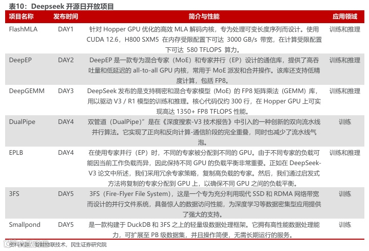 Deepseek技术开源日开放训练技术,加速训练与推理领域拓展。Deepseek在连续一周的开源日中,开放了多个提升训练与推理的软件项目,从而帮助客户提升训练与推理效率。其中首日开放的FlashMLA技术,通过MLA解码优化与分页KV缓存技术,显著提升硬件利用率,加速大语言模型解码过程,有效提高响应速度与吞吐量,适用于各种实时对话生成场景。