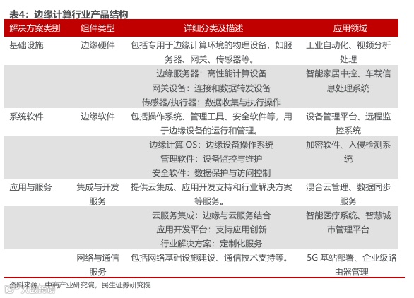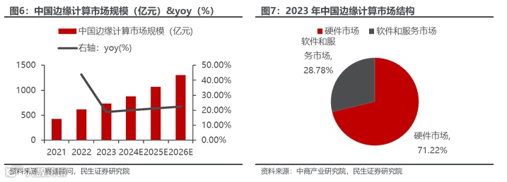 边缘计算市场增速明显,市场潜力广阔。边缘计算通过在网络边缘部署数据处理功能,靠近数据源,有效降低了响应时间并提升了数据处理的即时性。随着数据流量激增,边缘计算凭借低延迟、高带宽的特性,有望为物联网、自动驾驶、智能制造等领域提供实时和高效的数据处理。边缘计算产品结构分为基础设施(边缘硬件)、系统软件(边缘软件平台)和应用与服务(集成与开发服务、网络与通信服务)三大类。市场结构上,其中硬件市场占比达71.22%,软件和服务市场占比达28.78%。据赛迪顾问,2021-2026年,中国边缘计算市场规模有望从427亿元增长至1305.2亿元,CAGR达25.04%。边缘计算市场增速明显,市场潜力广阔。