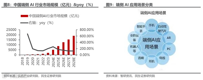 端侧AI市场维持高增速,多应用场景增加市场潜力。端侧AI将AI能力下沉到设备端,减少云服务依赖,从而实现数据隐私保护、更低网络需求和更快响应速度。端侧AI强调本地化运行,应用场景涉及多类端侧:手机、自动驾驶汽车、AR、PC、电视、耳机、音响、安防设备、智能手表和机器人等。多应用场景提升了端侧AI市场的增长潜力。据头豹产业研究院数据,2018-2023年,中国端侧AI市场从41亿元增长至1939亿元,CAGR达116.25%;经预测,2024-2028年,市场从5001亿元增长至19071亿元,CAGR达57.96%,端侧AI市场呈现较高增速。