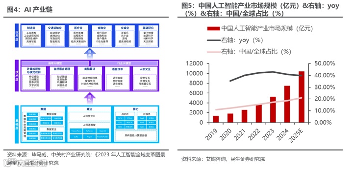AI产业链可分为基础层、技术层、应用层。基础层中分为数据、算法、算力及异构智能计算服务器。技术层分为通用大模型、行业大模型,如计算机视觉与模式识别、自然语言处理、类脑算法、语音技术及人机交互。应用层为AI模型对于具体行业的落地,可涉及制造业、交通运输行业、医疗业、金融业、文娱业及基础研究等。据艾媒咨询,2019年-2025年,中国人工智能产业市场规模有望从1372亿元增长至10457亿元,CAGR达40.28%,中国占全球市场占比有望从11.00%提升至20.90%。随着整个AI产业链技术的迭代升级及产业落地速度加快,AI市场规模持续扩容,有望迎来行业加速扩容期。