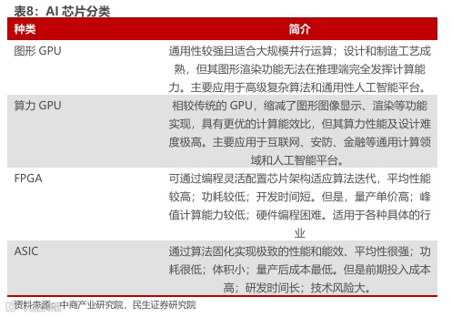 AI芯片目前以GPU为主,多品类各有特点,其他品类或逐步占据市场。AI芯片是针对AI算法做了特殊加速设计的芯片。AI芯片主要包括GPU、FPGA,以及以TPU、DPU、NPU为代表的ASIC芯片。目前以GPU数量占据主导,未来随着推理需求的提升,以TPU、DPU、NPU为代表的ASIC芯片有望逐步占据主流市场。