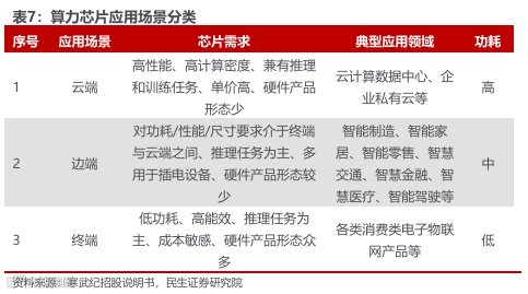 不同场景下AI芯片需求产生差异。根据承担任务不同,AI芯片可分为训练芯片、推理芯片。训练芯片用于构建神经网络模型,需要高计算性能、低功耗、注重计算能力。推理芯片利用训练好的神经网络模型进行推理预测,比较关注低延时、低功耗,对计算能力要求较低。