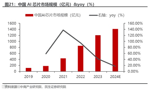 AI芯片市场持续增长。随着AI市场规模提升带动,主要的基础硬件设施AI芯片规模有望迎来高速增长。据中商产业研究院发布的《2024-2029年中国人工智能芯片行业市场发展监测及投资潜力预测报告》数据,2019-2024年,中国AI芯片市场规模从116亿元增长至1412亿元,CAGR达64.84%,AI芯片市场规模持续增长。