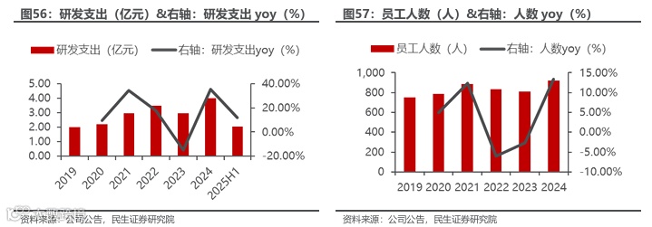 重视研发与人才储备,人均创收恢复高增速。公司研发投入恢复快速增长,2019-2024年,公司研发投入从2.00亿元增长至4.00亿元,CAGR达14.87%。2023年受整体经济环境下行影响,研发投入出现下滑。2025H1,公司研发支出为2.03亿元,同比增长12.15%,研发投入持续增长。公司员工人数恢复增长态势,公司员工人数从2019年的752人增长至2024年的920人,其中2022、2023年人数出现下降,2024年重新恢复快速增长态势,公司整体呈现扩张趋势。