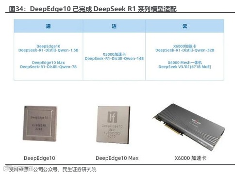 DeepEdge10已完成DeepSeek R1系列模型适配。公司芯片团队完成 DeepEdge10 “算力积木”芯片平台与DeepSeek-R1-Distill-Qwen-1.5B、DeepSeek-R1-Distill-Qwen-7B、DeepSeek-R1-Distill-Llama-8B大模型的适配,可以交付客户使用。DeepSeek-R1-Distill-Qwen-32B、DeepSeek-R1-Distill-Llama-70B大模型、DeepSeek V3/R1 671B MoE大模型也在有序适配中。适配完成后,DeepEdge10芯片平台将在端、边、云全面支持DeepSeek全系列模型。